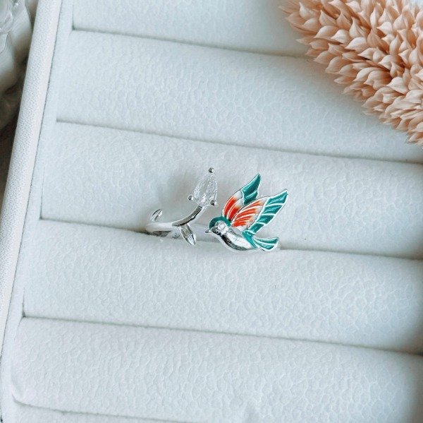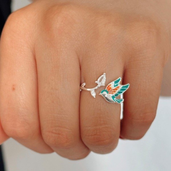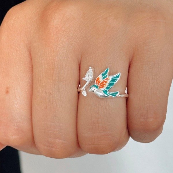 Diseño: Anillo con forma de colibrí y hojas - esmaltado en color verde, naranja, blanco - detalle en cubic cristal