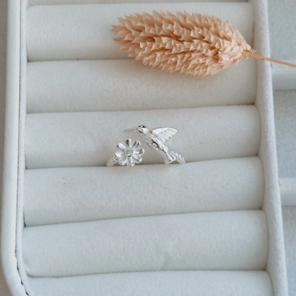 Diseño: Anillo con colibrí y flor con detalle en cubic
