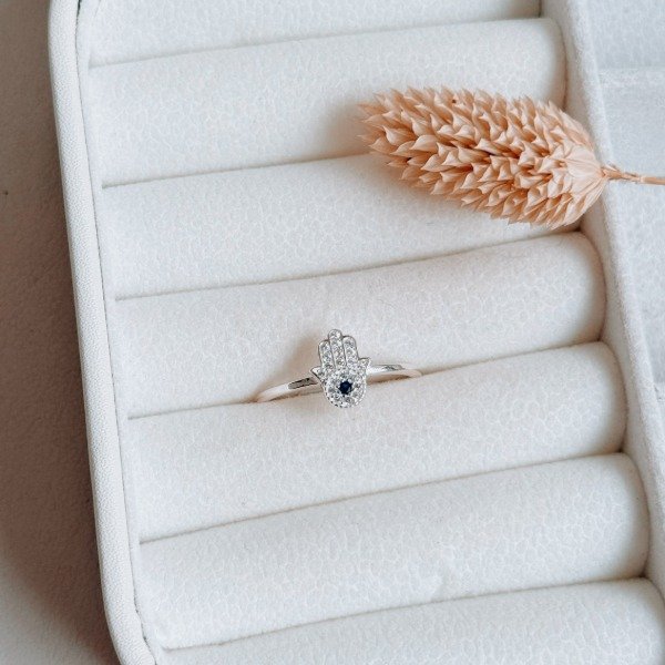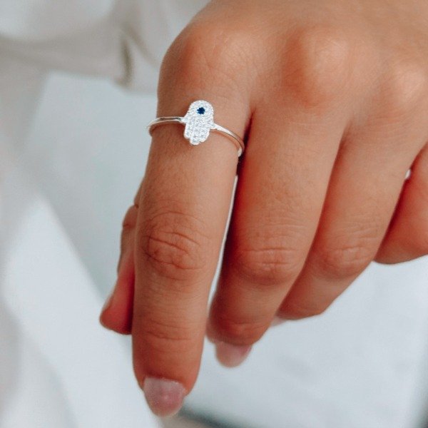Diseño: Anillo en forma de mano de Fátima con micro cubic cristal y cubic color celeste