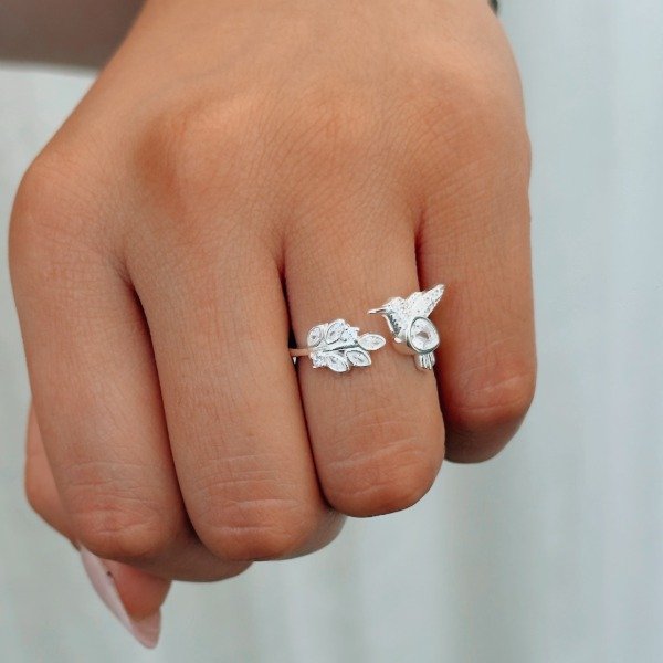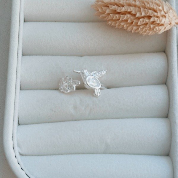 Diseño: Anillo en forma de colibrí y ramita con detalles en cubic