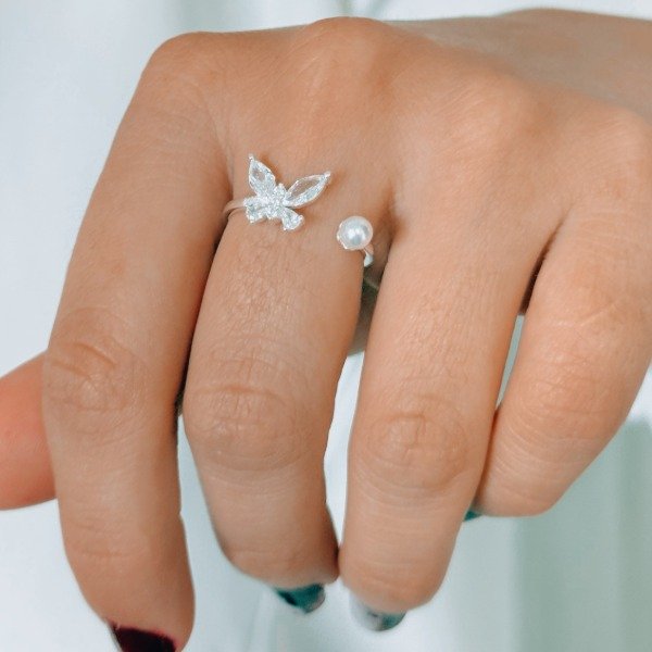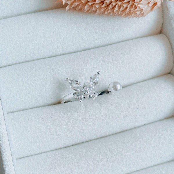 Diseño: Anillo con forma de mariposa en cubic cristal y perla blanca