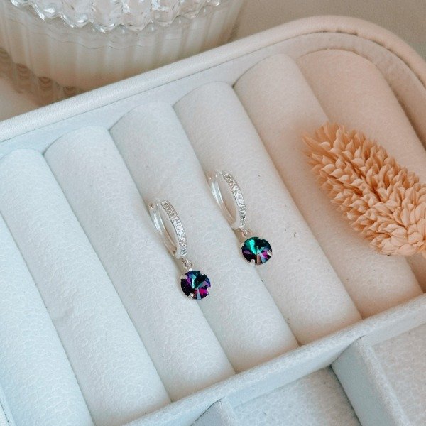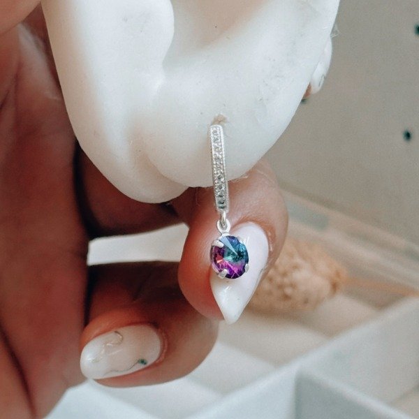 Diseño: Aros argolla con detalles en micro cubic cristal y cubic tornasolado colgante en forma circular