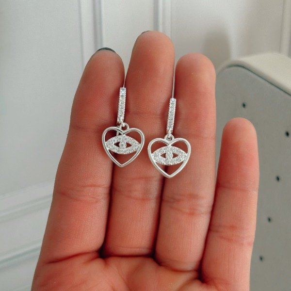 Diseño: Aros argolla con colgante en forma de corazón y en el centro un ojo turco con detalles en micro cubic