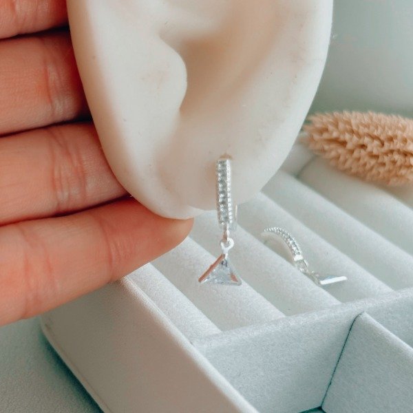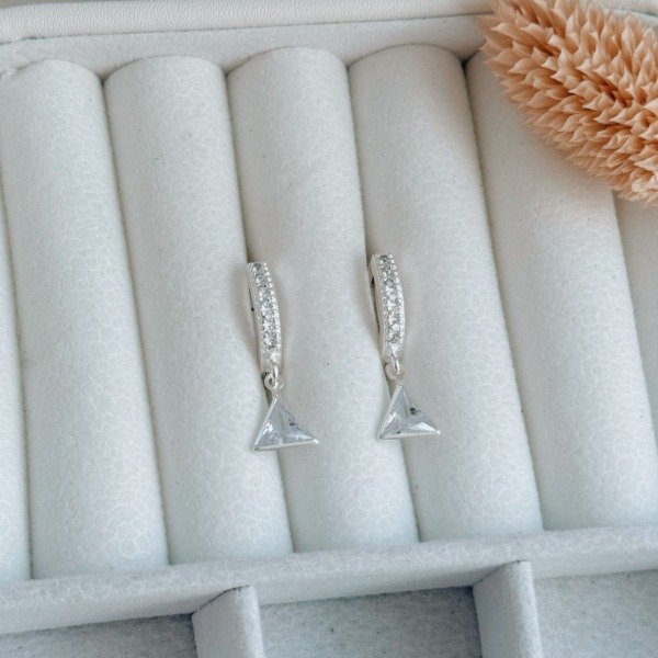 Diseño: Aros argolla con dije en forma de triangulo de cristal y detalles micro cubic