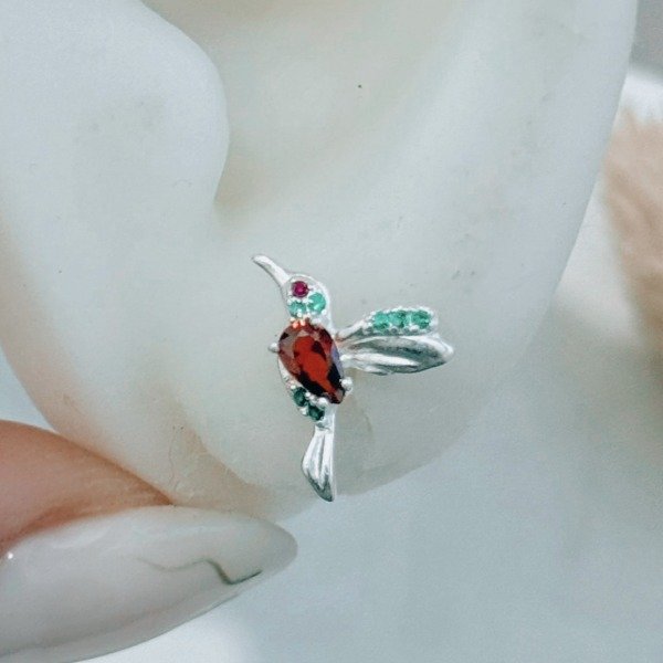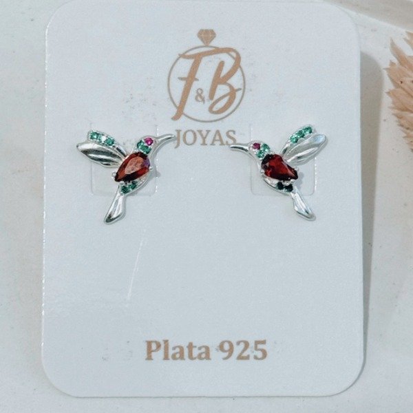 Diseño: Aros pasantes en forma de colibrí con cubic en color rojo, cristal y verde