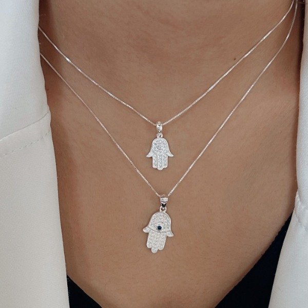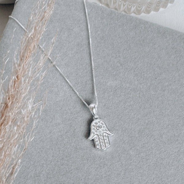 Diseño: Dije en forma de mano de Fátima con detalles en micro cubic cristal
