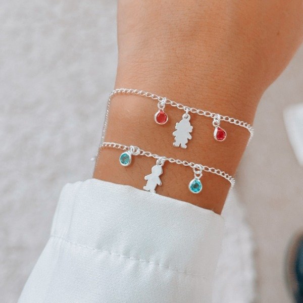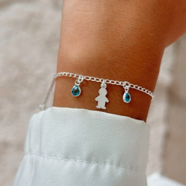Diseño: Pulsera con dije de nene y dijes colgando de cristal azul