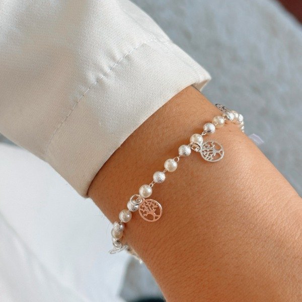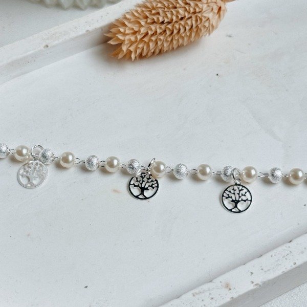Diseño: Pulsera con perlas blancas intercaladas con perlas laminadas en plata esmerilada y dijes del árbol de la vida