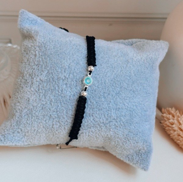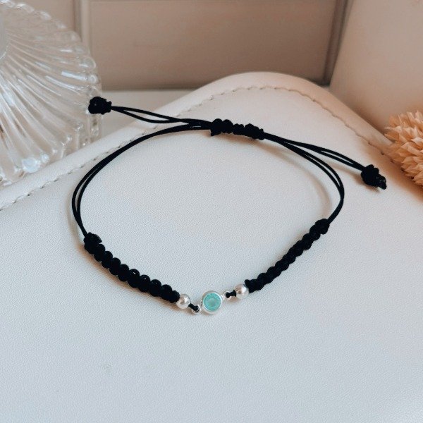 Diseño: Pulsera de hilo negro con bolitas en plata laminada y cubic color celeste