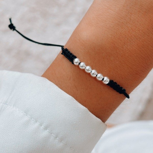 Diseño: Pulsera de hilo negro con bolitas en plata laminada