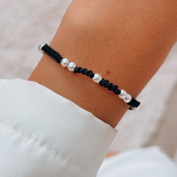 Diseño: Pulsera de hilo negro con bolitas en plata laminada
