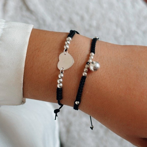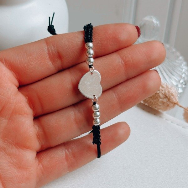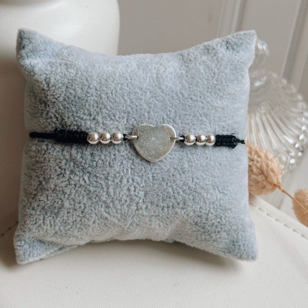 Diseño: Pulsera de hilo negro con dije de corazón y bolitas en plata laminada